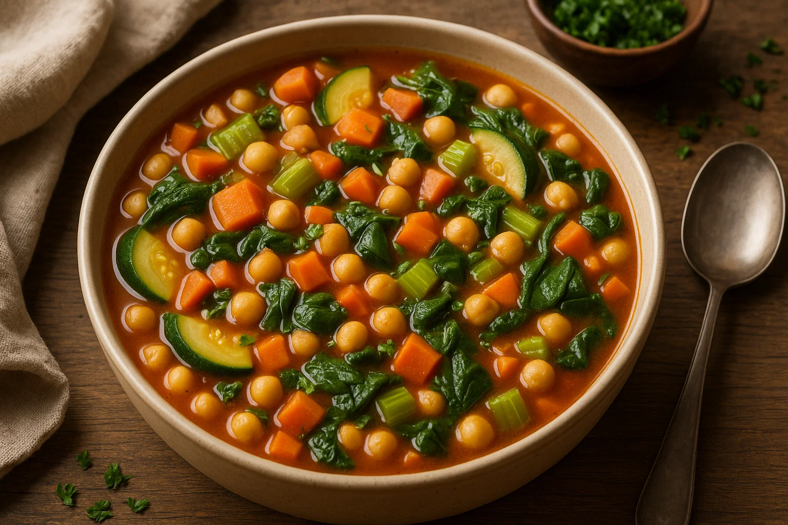 포인트 병아리콩은 고단백, 고식이섬유 식품으로 혈당 조절에도 탁월합니다. 토마토는 라이코펜이 풍부해 항산화 효과를 높여줍니다. 채소는 작게 썰어 충분히 익히고, 허브 향으로 풍미를 살리면 소금 사용도 줄일 수 있어요.