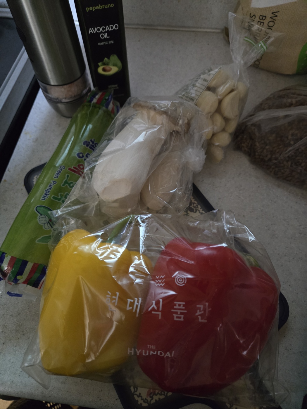재료: 애호박, 빨간 파프리카, 노란 파프리카, 새송이버섯.