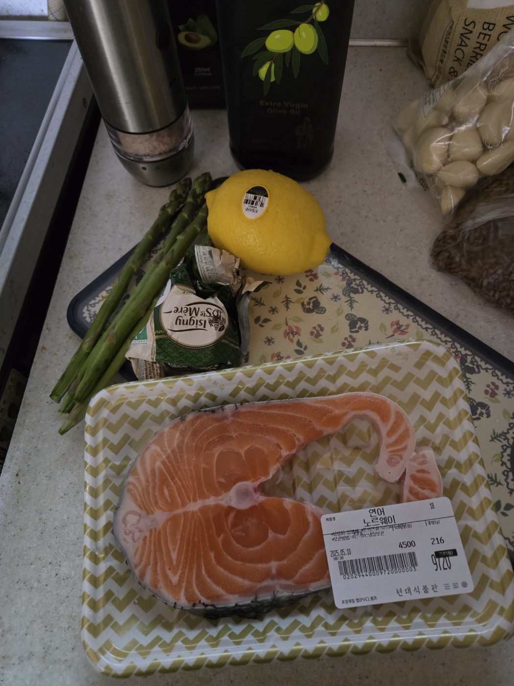 재료: 노르웨이 연어 스테이크용, 아스파라거스, 통마늘, 레몬, 오늘의 킥 버터 한조각